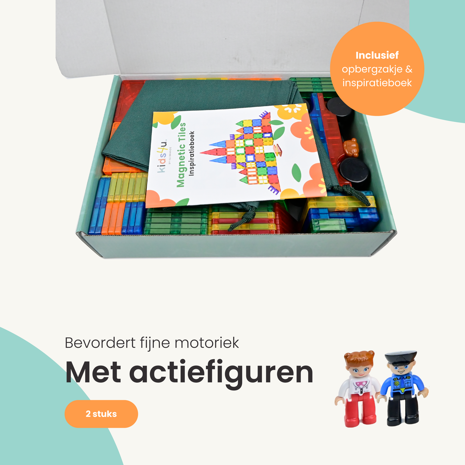 De set bevat 125 magnetische tegels in verschillende vormen, 2 auto-onderstellen, 2 speelfiguren, een opbergzak én een inspiratieboekje.